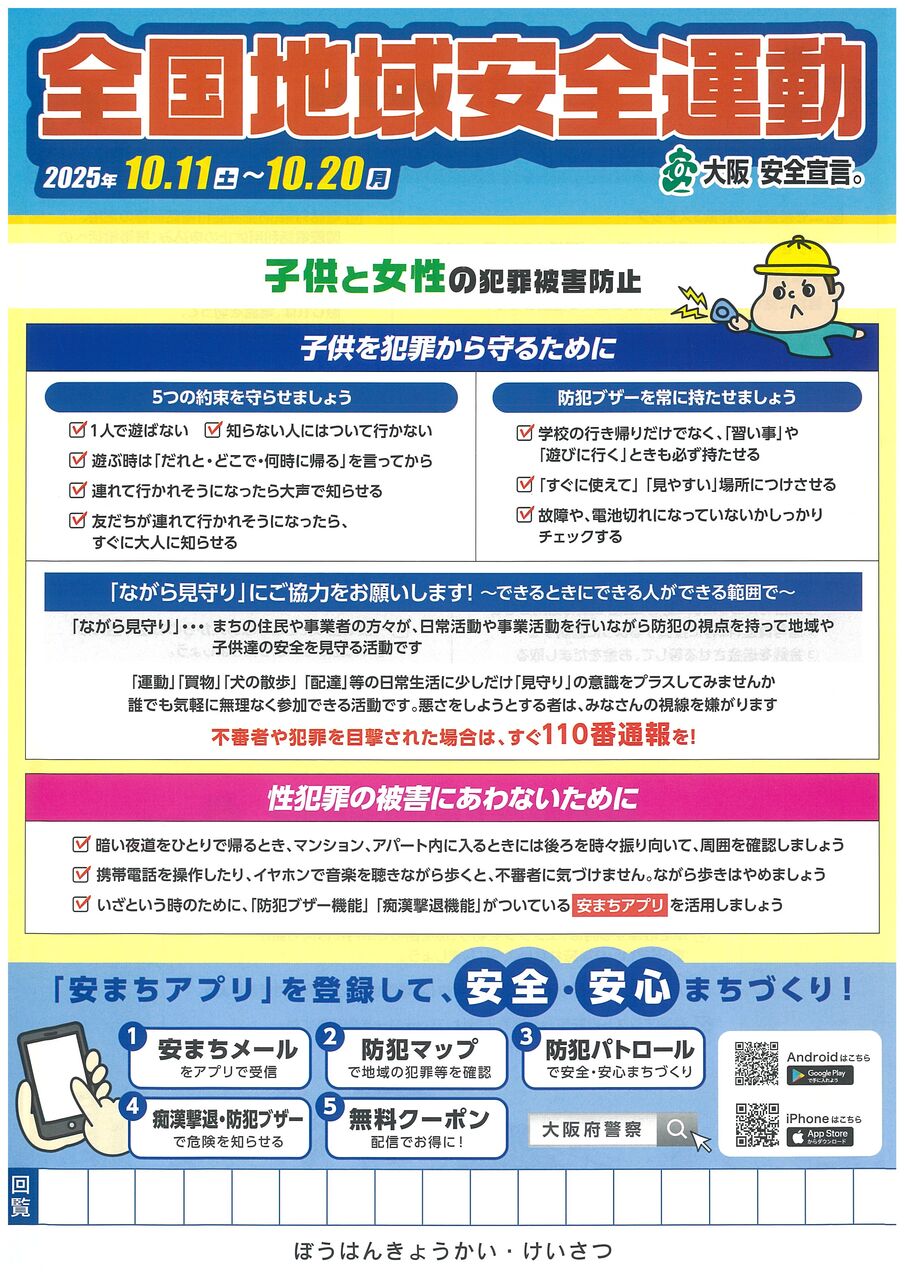 全国地域安全運動&「いばらきキャンペーン」 2025年09月26日 2025年10月11日~10月20日の間「全国地域安全運動」が実施されます。それに伴い、【いばらきキャンペーン】を行います。ご参加お待ちしております。 < 前の記事 コメント コメントフォーム 名前 コメント 記事の評価 リセット リセット 顔 星 情報を記憶 コメントを投稿する